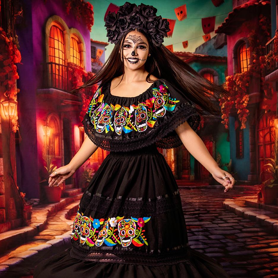 Vestido de calaveras, vestido de la catrina, vestido de la muerte, vestido del Día de muertos, fiesta mexicana,5 de mayo, of the shoulders